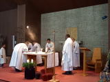 死から命へと歩まれた主の過ぎ越しを祝うミサが光の祭儀によって盛大に始まりました。 火の祝福、復活のろうそくに火がともり 司祭と侍者が祭壇に向かって行列、復活ろうそくから各々のろうそくに火がともされ、復活賛歌が歌われました。 二つの第一朗読・第二朗読・福音書の朗読と説教の後、再び復活のろうそくから各々のろうそくに火がともされ、祝福された水を司祭からふりかけていただき、洗礼の約束の更新をしました。 この日はキリストの受難と死を思い起こす典礼がささげられます。 ヨハネによる主イエス・キリストの受難が朗読されました。 盛式祈願が行なわれました。その後、十字架の顕示と礼拝が行なわれ、各々十字架の前に進み、崇敬を表しました。 聖木曜日の夕刻に行なわれるこのミサでは、キリストが聖体を制定し、自らの記念として行なうよう命じた最後の晩さんを直接に記念します。